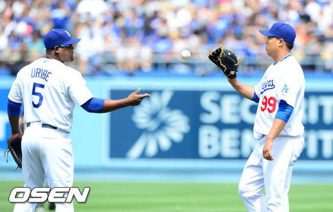 4회초 콜로라도 선두타자 러틀리지의 타구를 3루수 땅볼로 처리 한 다저스 선발 류현진이 다저스 3루수 후안 유리베에게 공을 받으며 얘기를 나누고 있다. /jpnews@osen.co.kr