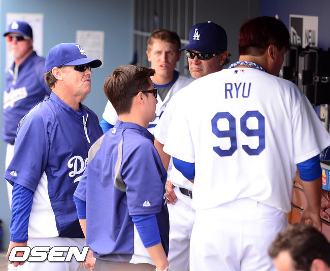 2회를 마친 다저스 선발 류현진이 돈 매팅리 감독과 릭 허니컷 투수 코치와 얘기를 나누고 있다. /jpnews@osen.co.kr
