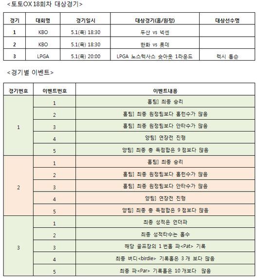 국민체육진흥공단(www.kspo.or.kr)이 발행하는 체육진흥투표권 수탁사업자인 스포츠토토(www.sportstoto.co.kr)가 오는 5월 1일 벌어지는 KBO 두산-넥센(1경기), KBO 한화-롯데(2경기), LPGA 노스텍사스 슛아웃 1라운드 '렉시 톰슨'(3경기) 등 3경기를 대상으로 '토토OX' 18회차를 발매한다고 밝혔다.