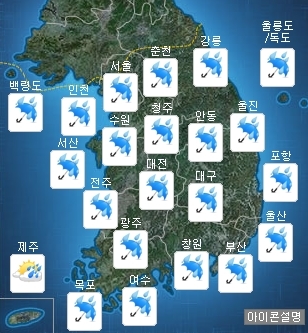 기상청의 28일 예보에 따르면 전국이 흐리고 비가 오다가 오전에 서울, 경기, 강원도영서부터 점차 그치기 시작하겠다.
