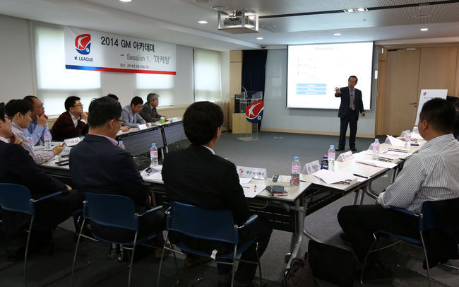 29일 축구회관 다목적회의실에서 처음 열린 K리그 GM 아카데미 세션 1은 마케팅을 주제로 진행됐다. 구단 사무국장과 선임급 팀장 총 23명이 참석한 가운데 ▲마케팅 마인드 제고와 마케팅 능력 향상과정 ▲목표달성을 위한 부서장 리더십(이상 나종호 한국강소기업연구원장) ▲미국 메이저리그축구(MLS) 사례발표(김정윤 웨슬리퀘스트 이사)를 주제로 강의를 듣고 의견을 나눴다.