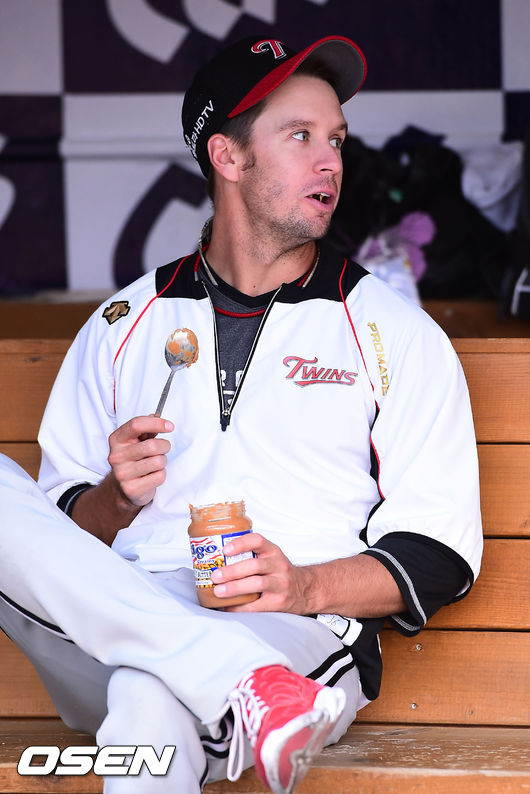 29일 오후 경남 마산구장에서 열린 '2014 한국야쿠르트 세븐 프로야구' NC 다이노스와 LG 트윈스의 경기에 앞서 LG 티포드가 땅콩잼을 먹고 있다.