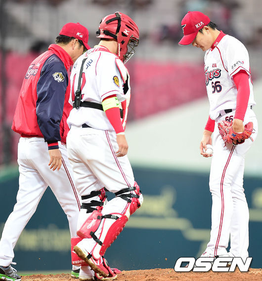 2회초 SK 공격 무사 만루 상황에서 KIA 선발 한승혁이 강판되고 있다.