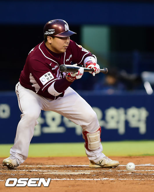 29일 오후 서울 잠실야구장에서 열린 ‘2014 한국야쿠르트 세븐 프로야구’ 두산 베어스와 넥센 히어로즈 경기, 3회 초 무사 주자 1루 넥센 허도환이 희생번트에 성공하고 있다.