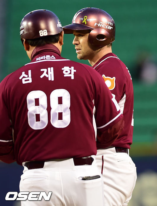 29일 오후 서울 잠실야구장에서 열린 ‘2014 한국야쿠르트 세븐 프로야구’ 두산 베어스와 넥센 히어로즈 경기, 3회초 1사 주자 2,3루 넥센 로티노가 1타점 동점 적시타를 날린 후 1루에서 심재학 코치와 하이파이브를 하고 있다.