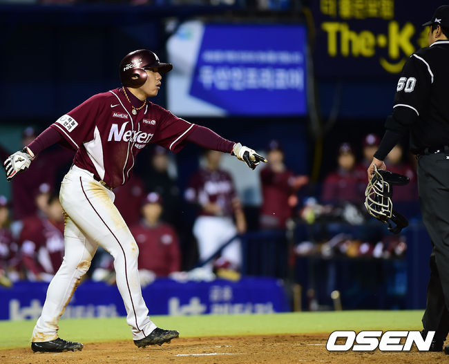 29일 오후 서울 잠실야구장에서 열린 ‘2014 한국야쿠르트 세븐 프로야구’ 두산 베어스와 넥센 히어로즈 경기, 4회초 2사 주자 1,2루 넥센 서건창의 중견수 왼쪽 1루타때 2루 주자 문우람이 3루를 돌아 홈으로 쇄도했으나 홈에서 두산 양의지에게 태그아웃 당했다. 문우람이 김정국 구심에게 항의를 하고 있다.