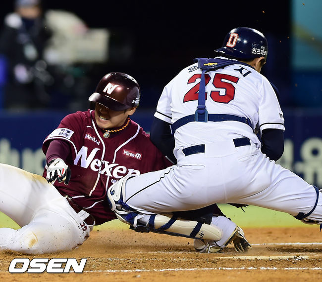 29일 오후 서울 잠실야구장에서 열린 ‘2014 한국야쿠르트 세븐 프로야구’ 두산 베어스와 넥센 히어로즈 경기, 4회초 2사 주자 1,2루 넥센 서건창의 중견수 왼쪽 1루타때 2루 주자 문우람이 3루를 돌아 홈으로 쇄도했으나 홈에서 두산 양의지에게 태그아웃 당하고 있다.