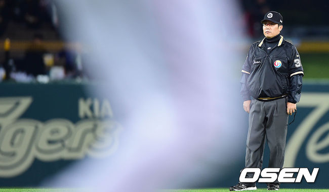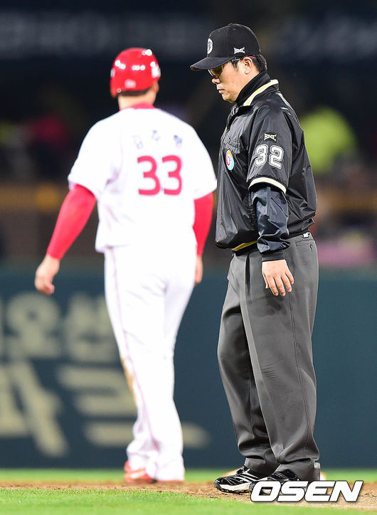 2회초 SK 공격 무사 1, 3루 상황 1루 주자 조동화가 2루 도루를 시도해 KIA 2루수 안치홍의 태그를 피해서 세이프 됐다는 받았다. 사진은 이 상황을 판정한 나광남 심판이 3회초 박근영 심판으로 교체돼 그라운드로 나선 모습.