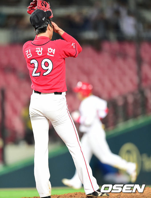 4회말 KIA 공격 무사 1루 상황 안치홍에게 추격의 좌중간 투런포를 허용한 SK 선발 김광현이 아쉬워하고 있다.