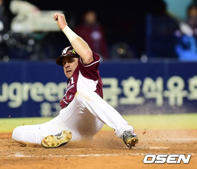 29일 오후 서울 잠실야구장에서 열린 ‘2014 한국야쿠르트 세븐 프로야구’ 두산 베어스와 넥센 히어로즈 경기, 5횣 2사 주자 2루 넥센 강정호의 좌익수 앞 1타점 적시타때 2루 주자 로티노가 홈으로 몸을 날리며 세이프 되고 있다.