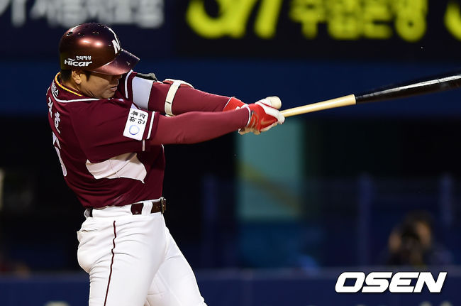 29일 오후 서울 잠실야구장에서 열린 ‘2014 한국야쿠르트 세븐 프로야구’ 두산 베어스와 넥센 히어로즈 경기, 5회초 2사 주자 2루 넥센 강정호가 좌익수 앞 1타점 적시타를 날리고 있다.