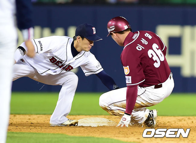29일 오후 서울 잠실야구장에서 열린 ‘2014 한국야쿠르트 세븐 프로야구’ 두산 베어스와 넥센 히어로즈 경기, 5회초 2사 주자 1,3루 넥센 문우람 타석에서 1루 주자 이성열이 2루 도루를 시도했으나 2루에서 두산 유격수 김재호에게 태그아웃 당하고 있다.