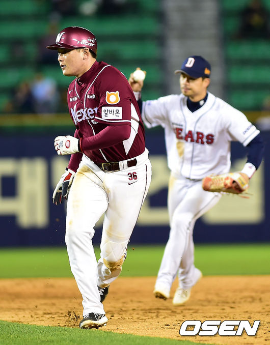 29일 오후 서울 잠실야구장에서 열린 ‘2014 한국야쿠르트 세븐 프로야구’ 두산 베어스와 넥센 히어로즈 경기, 5회초 2사 주자 1,3루 넥센 문우람 타석에서 1루 주자 이성열이 2루 도루를 시도했으나 런다운에 걸리며 오재원에게 쫓기고 있다.