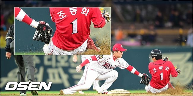 29일 광주 챔피언스필드에서 열린 '2014 한국야쿠르트 세븐 프로야구' SK 와이번스-KIA 타이거즈전. 2회 SK 조동화가 무사 1,3루에서 2루 도루를 시도했다. 조동화는 베이스에 슬라이딩하던 도중 2루수 안치홍에게 태그 아웃됐으나 나광남 2루심은 세이프를 선언했다.