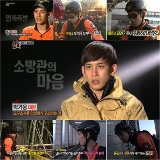 지난 29일 방송된 SBS 예능프로그램 '심장이 뛴다'에서는 박기웅이 구조대원들과 함께 30층 높이 건물 옥상에서 자살시도를 하는 남자를 구조하는 모습이 그려졌다. 이 남자는 복잡한 보상문제가 해결되지 않자 옥상에 오른 것. 이날 박기웅은 "현장에 도착했을 때 9개월 동안 소방관으로 활동하면서 이런 출동은 처음이었다. 상황이 진짜 긴박했다"고 말했다.