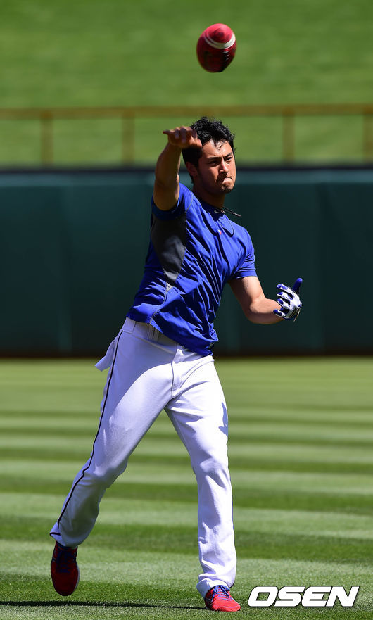 30일(이하 한국시간) 미국 텍사스주 알링턴 글로브 라이프 파크에서 열리는 '2014 메이저리그' 텍사스 레인저스와 오클랜드 애슬레틱스의 경기 시작전 다르빗슈가 미식축구 공을 던지고 있다.