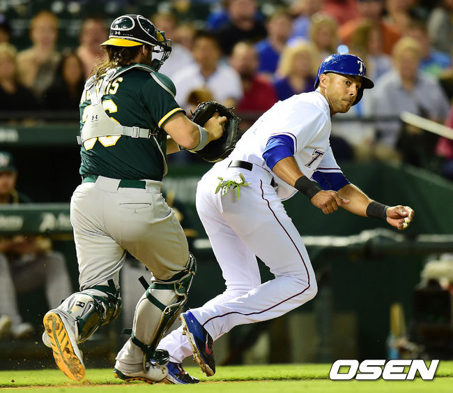 30일(이하 한국시간) 미국 텍사스주 알링턴 글로브 라이프 파크에서 열린 '2014 메이저리그' 텍사스 레인저스와 오클랜드 애슬레틱스의 경기 4회말 1사 1,3루 마틴의 내야땅볼에 3루주자 리오스가 협살에 걸려 태그아웃 당하고 있다.