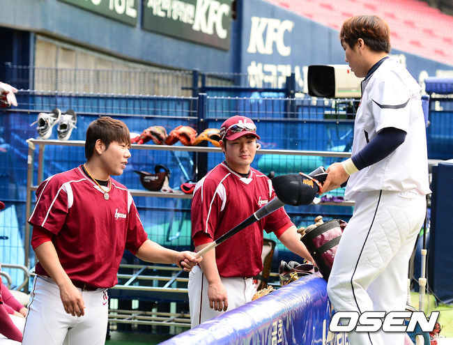 30일 오후 서울 잠실야구장에서 열린 ‘2014 한국야쿠르트 세븐 프로야구’ 두산 베어스와 넥센 히어로즈 경기에 앞서 넥센 강정호와 두산 김현수가 이야기를 나누고 있다.