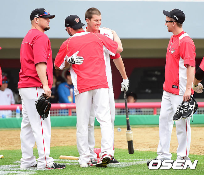 30일 오후 광주 챔피언스필드에서 열리는 '2014 한국야쿠르트 세븐 프로야구' KIA 타이거즈 대 SK 와이번스의 경기를 앞두고 KIA 외국인선수 브렛 필과 SK 외국인선수 레이예스, 스캇, 울프가 인사를 나누고 있다.