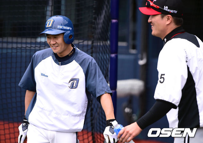 30일 오후 경남 마산구장에서 열린 '2014 한국야쿠르트 세븐 프로야구' NC 다이노스와 LG 트윈스의 경기 전 LG 이진영과 NC 손시헌이 이야기를 나누고 있다.
