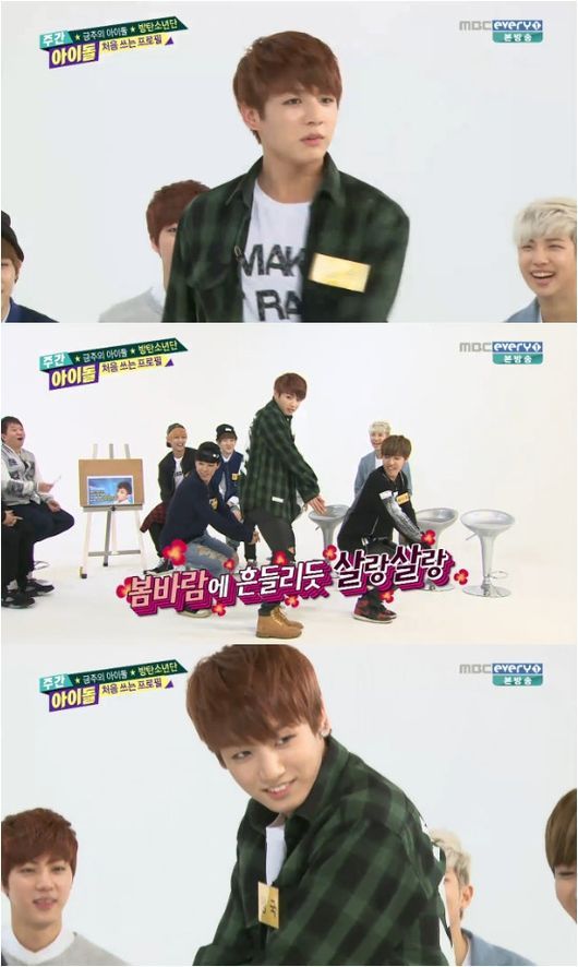 정국은 30일 방송된 MBC에브리원 예능프로그램 ‘주간아이돌’에서 걸스데이의 ‘썸씽(Somthing)’에 맞춰 섹시 댄스를 소화했다. 그는 다소 끈적거리는 섹시 댄스를 묘한 표정과 함께 자유자재로 표현했다.