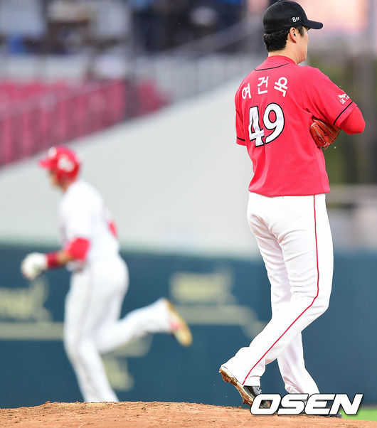1회말 KIA 공격 2사 주자없는 상황 브렛 필에게 동점 좌월 솔로포를 허용한 SK 선발 여건욱이 아쉬워하고 있다.
