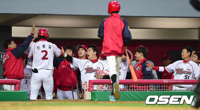 2회말 KIA 공격 1사 주자없는 상황 신종길이 역전 중월 솔로포를 날리고 홈을 밟은 뒤 더그아웃 동료들과 인사를 나누고 있다.