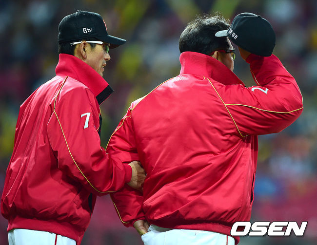 3회초 SK 공격 1사 1루 상황 주자 조동화가 2루 도루를 시도하다 아웃되자 SK 이만수 감독(오른쪽)이 그라운드로 나와 항의하고 있다.