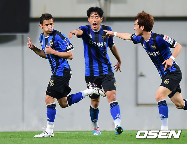 30일 오후 서울 월드컵 경기장에서 열린 ‘2014 하나은행 FA컵’ 32강전 FC 서울과 인천 유나이티드의 경기, 전반 인천 주앙 파울로가 동점골을 성공시킨 후 기뻐하고 있다.