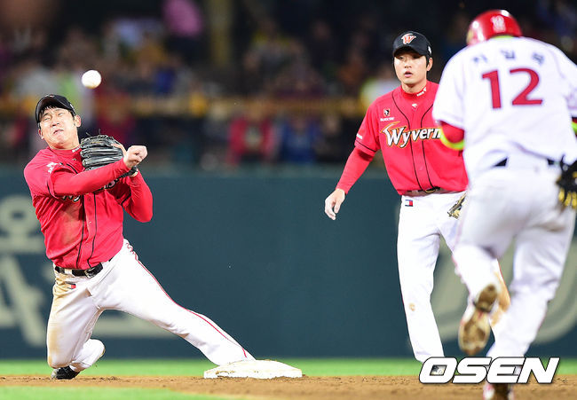 4회말 KIA 공격 2사 1, 2루 상황 김선빈의 내야 땅볼 때 타구를 잡은 SK 2루수 신현철이 직접 2루 베이스를 밟아 주자 차일목을 포스아웃 시킨 뒤 1루로 송구하고 있다.