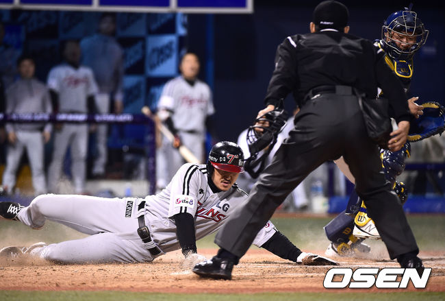 30일 오후 경남 마산구장에서 열린 '2014 한국야쿠르트 세븐 프로야구' NC 다이노스와 LG 트윈스의 경기,7회초 2사 1루 LG 조쉬벨의 1타점 적시타때 1루 주자 박용택이 홈에서 세이프되고 있다.