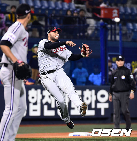 30일 오후 경남 마산구장에서 열린 '2014 한국야쿠르트 세븐 프로야구' NC 다이노스와 LG 트윈스의 경기,7회말 2사 1루 NC 박민우의 안타성 타구를 LG 조쉬벨 3루수가 호수비 펼치며 아웃카운트를 잡고 있다.