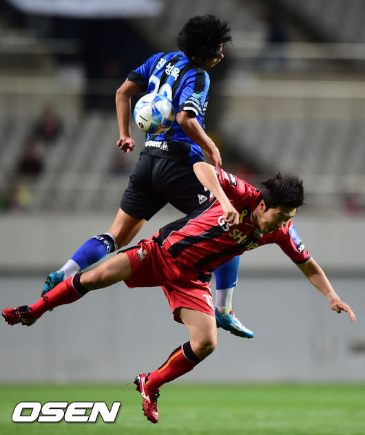 30일 오후 서울 월드컵 경기장에서 열린 ‘2014 하나은행 FA컵’ 32강전 FC 서울과 인천 유나이티드의 경기, 후반 서울 최현태와 인천 진성욱이 공중볼 다툼을 하고 있다.
