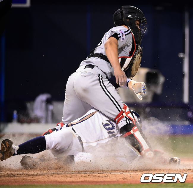 30일 오후 경남 마산구장에서 열린 '2014 한국야쿠르트 세븐 프로야구' NC 다이노스와 LG 트윈스의 경기, 8회말 무사 1,2루 NC 이호준의 1타점 적시타때 2루 주자 이종욱이 홈에서 세이프되고 있다.