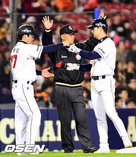 30일 오후 서울 잠실야구장에서 열린 ‘2014 한국야쿠르트 세븐 프로야구’ 두산 베어스와 넥센 히어로즈 경기, 7회말 1사 1루 1타점 3루타를 날린 오재원이 3루에서 전형도 코치와 하이파이브를 나누고 있다.