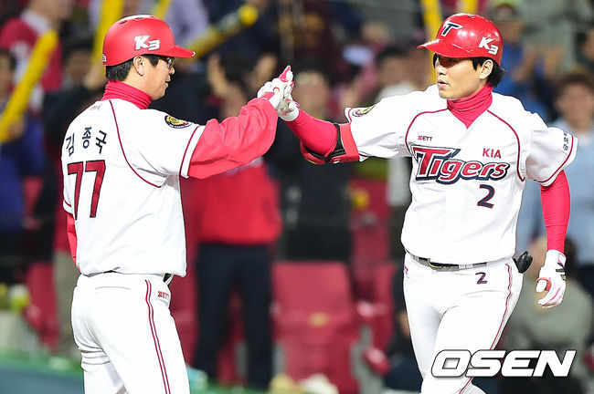 6회말 KIA 공격 선두타자로 나선 신종길이 좌중간 솔로포를 날리고 그라운드를 돌며 김종국 코치와 인사를 나누고 있다.