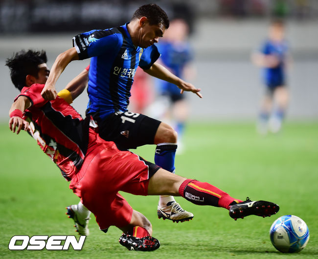 30일 오후 서울 월드컵 경기장에서 열린 ‘2014 하나은행 FA컵’ 32강전 FC 서울과 인천 유나이티드의 경기, 후반 종료가 얼마 남지 않은 상황에서 주앙 파울로가 돌파를 시도하던 중 서울 김주영의 태클을 받고 있다.