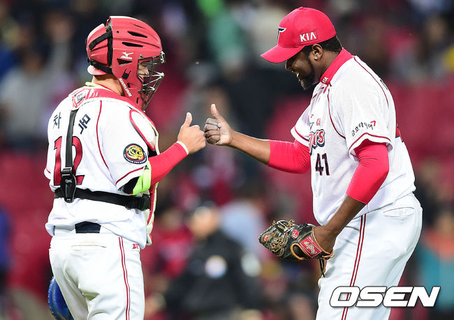 경기를 마무리지은 KIA 마무리투수 어센시오와 포수 차일목이 환호하고 있다./dreamer@osen.co.kr