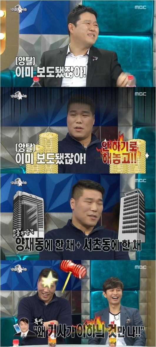 서장훈은 크게 당황하며 “그런 것 안하기로 하지 않았느냐”고 발끈했다. 김구라는 “내가 특종을 터뜨린 것도 아니지 않느냐. 이미 보도된 거다”라고 해명하며 “양재동, 서초동 하나씩 있다”고 폭로를 이어갔다.