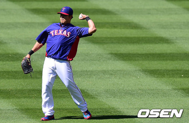 1일(이하 한국시간) 미국 텍사스주 알링턴 글로브 라이프 파크에서 열리는 '2014 메이저리그' 텍사스 레인저스와 오클랜드 애슬레틱스의 경기 시작전 추신수가 외야에서 훈련을 하고 있다.