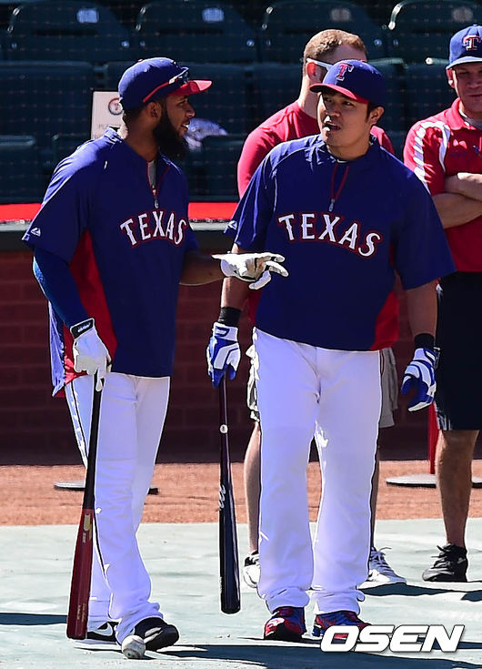 1일(이하 한국시간) 미국 텍사스주 알링턴 글로브 라이프 파크에서 열리는 '2014 메이저리그' 텍사스 레인저스와 오클랜드 애슬레틱스의 경기 시작전 추신수가 앤드루스와 이야기를 나누고 있다.