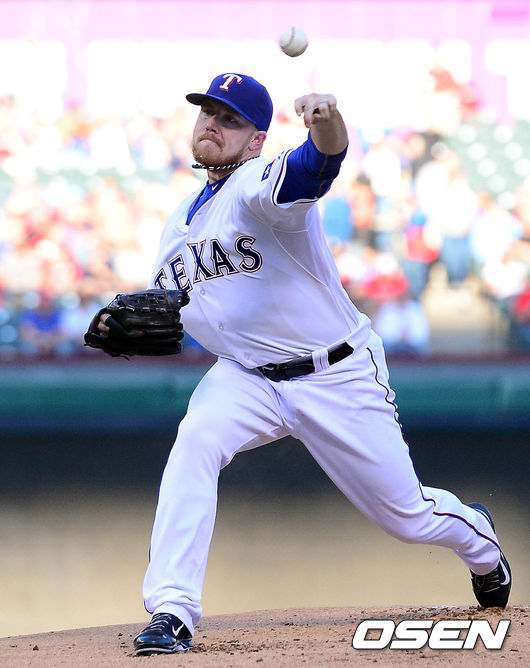 1일(이하 한국시간) 미국 텍사스주 알링턴 글로브 라이프 파크에서 열린 '2014 메이저리그' 텍사스 레인저스와 오클랜드 애슬레틱스의 경기 텍사스 선발 로비 로스가 역투하고 있다.
