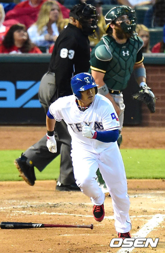1일(이하 한국시간) 미국 텍사스주 알링턴 글로브 라이프 파크에서 열린 '2014 메이저리그' 텍사스 레인저스와 오클랜드 애슬레틱스의 경기 3회말 2사 추신수가 외야플라이를 치고 달리고 있다.