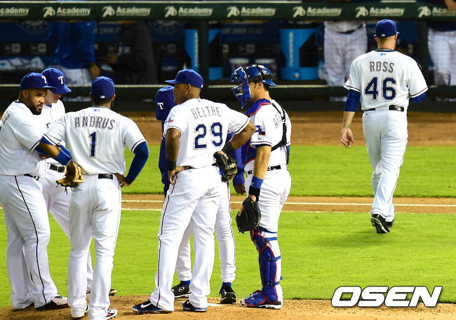 1일(이하 한국시간) 미국 텍사스주 알링턴 글로브 라이프 파크에서 열린 '2014 메이저리그' 텍사스 레인저스와 오클랜드 애슬레틱스의 경기 4회초 1사 로비 로스가 마운드를 내려가고 있다. 오간도로 교체.