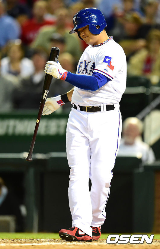 1일(이하 한국시간) 미국 텍사스주 알링턴 글로브 라이프 파크에서 열린 '2014 메이저리그' 텍사스 레인저스와 오클랜드 애슬레틱스의 경기 6회말 1사 추신수가 헛스윙 후 아쉬워 하고 있다.