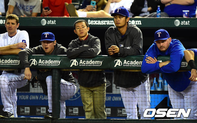 1일(이하 한국시간) 미국 텍사스주 알링턴 글로브 라이프 파크에서 열린 '2014 메이저리그' 텍사스 레인저스와 오클랜드 애슬레틱스의 경기 6회말 다르빗슈가 덕아웃에서 경기를 지켜보고 있다.