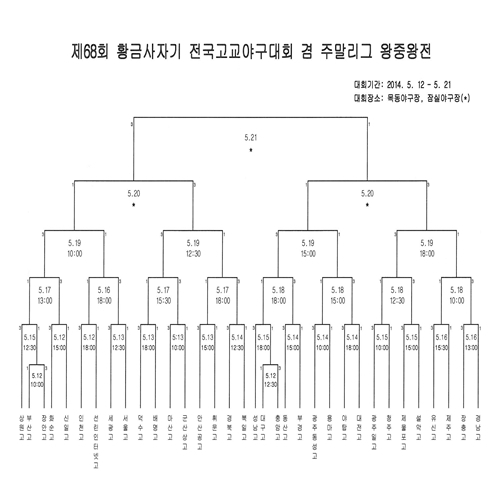 [OSEN=선수민 인턴기자] 제68회 황금사자기 전국고교야구대회 겸 주말리그 왕중왕전 대진표가 완성됐다. 주말리그 왕중왕전은 5월 12일부터 21일까지 목동 및 잠실야구장에서 열린다.