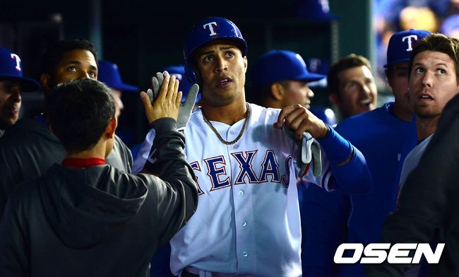 1일(이하 한국시간) 미국 텍사스주 알링턴 글로브 라이프 파크에서 열린 '2014 메이저리그' 텍사스 레인저스와 오클랜드 애슬레틱스의 경기 8회말 2사 1루 윌슨의 1타점 2루타에 1루주자 마틴이 득점 후 덕아웃에서 동료들과 하이파이브를 하고 있다.