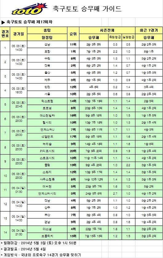 축구토토 승무패 17회차 게임은 3일 오후 1시 50분에 발매가 마감되며, 상세한 일정은 스포츠토토 및 스포츠토토 공식 온라인 발매 사이트인 베트맨에서 확인할 수 있다.