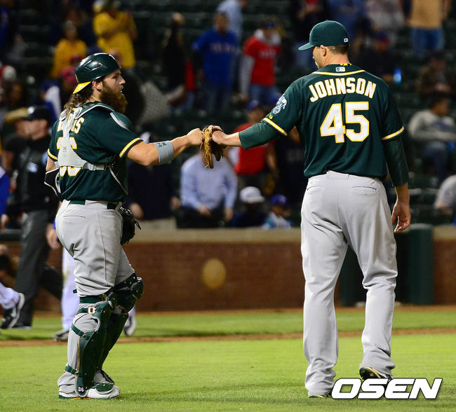 1일(이하 한국시간) 미국 텍사스주 알링턴 글로브 라이프 파크에서 열린 '2014 메이저리그' 텍사스 레인저스와 오클랜드 애슬레틱스의 경기 종료 후 노리스와 존슨이 하이파이브를 하고 있다.